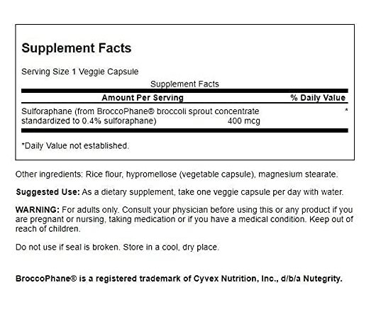 Sulforaphane 400 mcg *,Other ingredients: Rice flour, hypromellose (vegetable capsule), may contain one or both of the following: magnesium stearate, silica.,As a dietary supplement, take one capsule per day with water.