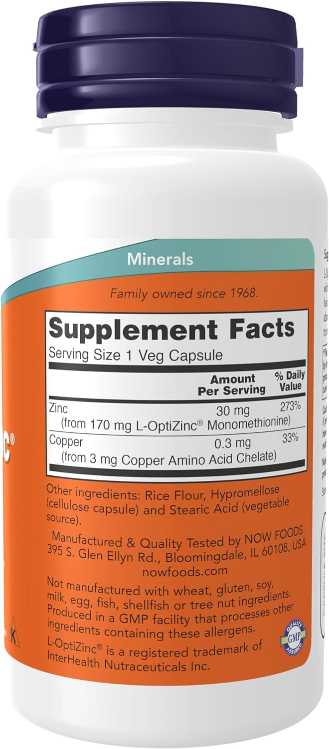 Supplement FactsServing Size:1 Veg CapsuleServings Per Container:100DescriptionAmount per Serving% Daily ValueZinc(from 170 mg L-OptiZinc® Monomethionine) 30 mg 273% Copper(from 3 mg Copper Amino Acid Chelate) 0.3 mg 33% Other Ingredients: Rice Flour, Hypromellose (cellulose capsule) and Stearic Acid (vegetable source). Not manufactured with wheat, gluten, soy, milk, egg, fish, shellfish or tree nut ingredients. Produced in a GMP facility that processes other ingredients containing these allergens. Caution: For adults only. Consult physician if pregnant/nursing, taking medication, or have a medical condition. Keep out of reach of children. L-OptiZinc® is a registered trademark of InterHealth Nutraceuticals Inc. Natural color variation may occur in this product. Store in a cool, dry place after opening. Family owned since 1968.