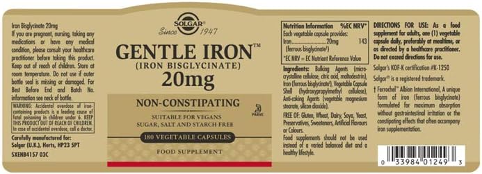 Solgar, Gentle Iron, 25 mg, 180 Vegetable Capsules